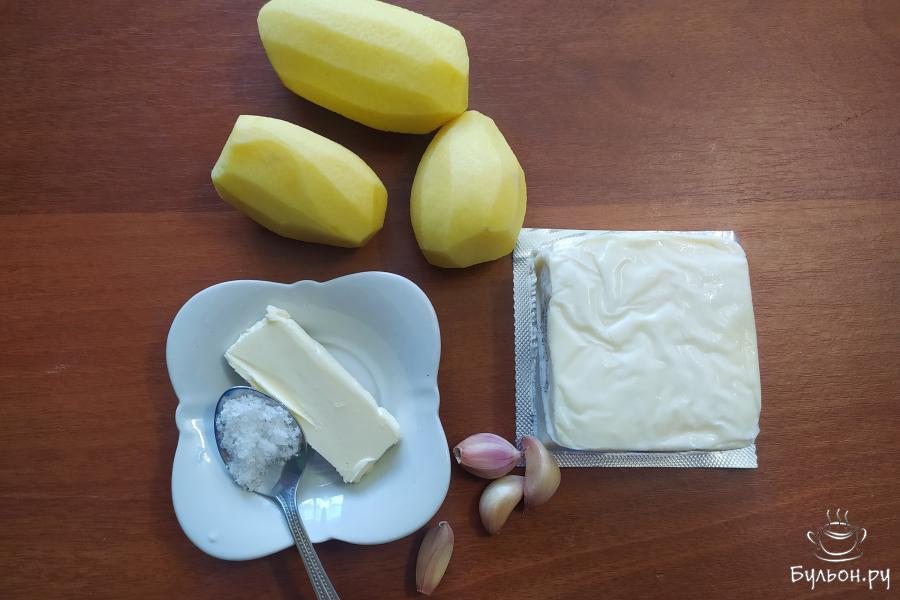 1. Для приготовления блюда возьмем такие ингредиенты: картофель, сливочное масло, чеснок, моцареллу и соль. Также нам понадобится растительное масло для смазывания формы.