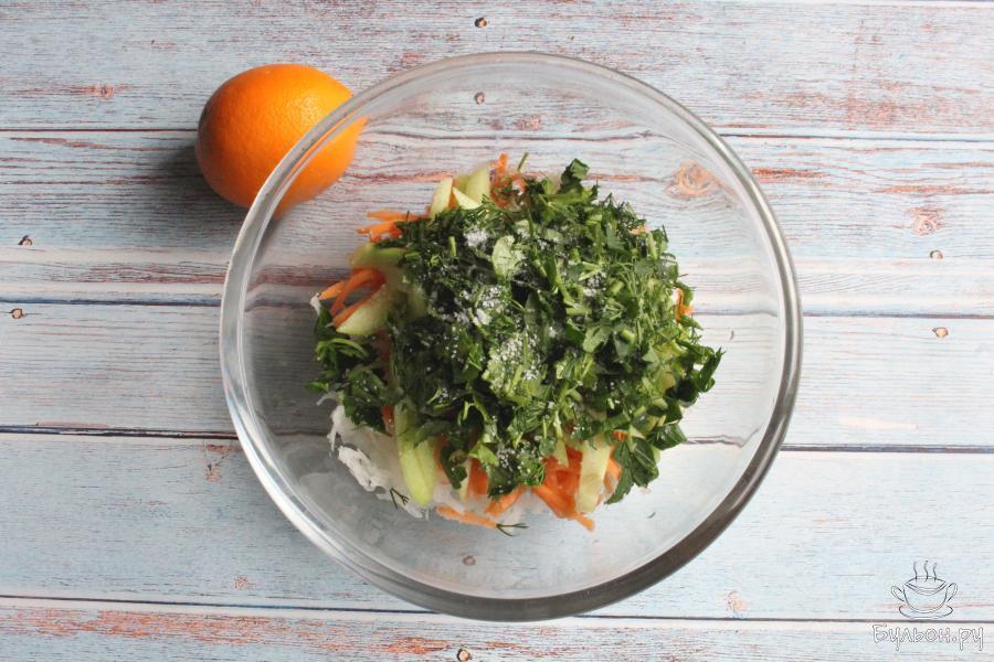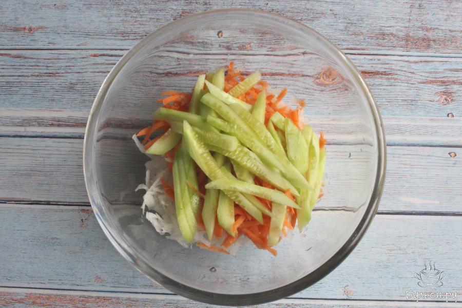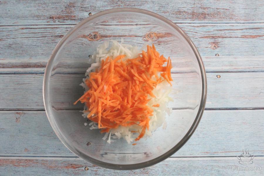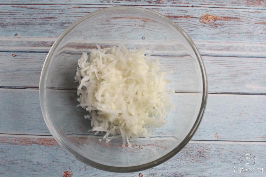 1. Дайкон промываем, чистим и перетираем через крупную терку. Если редка сухая или горчит, то заливаем дайкон водой и оставим на полчаса. Затем откинем дайкон на дуршлаг.