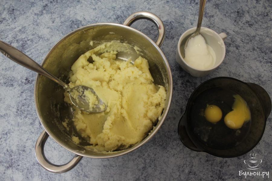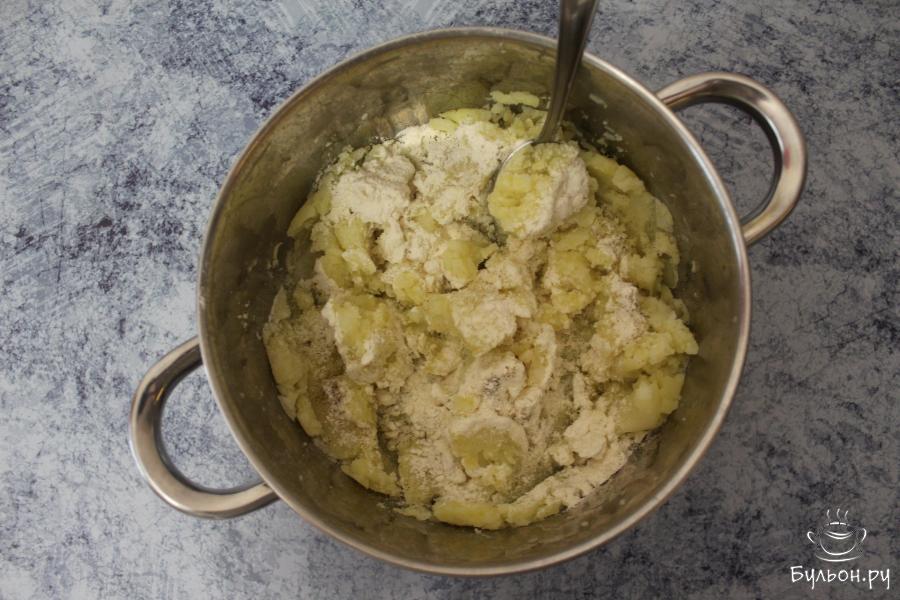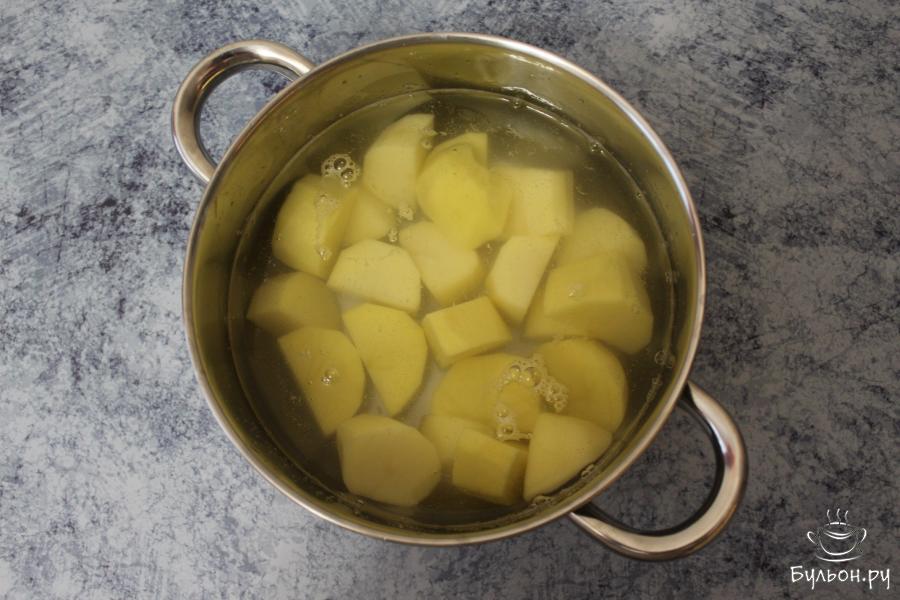 1. Очистим картофель, крупно нарежем его и отварим в воде без добавления соли, после чего сольем воду, вернем кастрюлю с картофелем на плиту и, помешивая клубни, испарим остатки влаги.