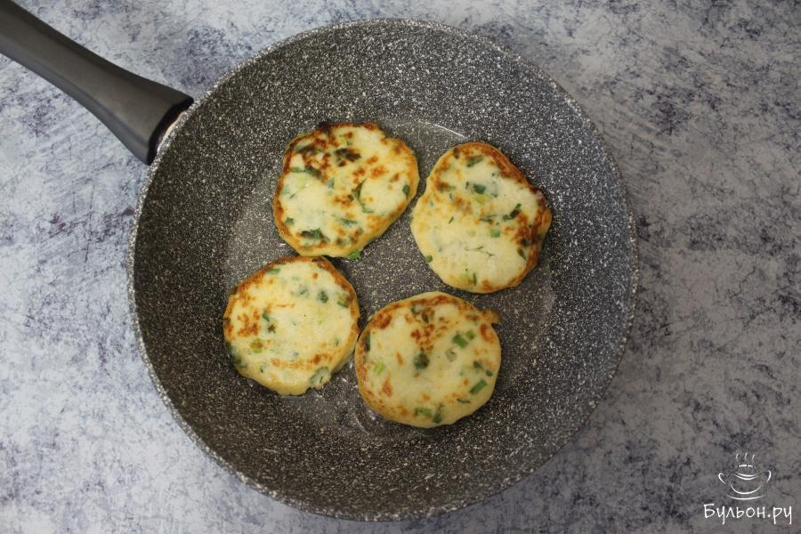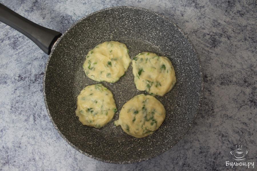 6. На прогретую сковороду с рафинированным маслом по одной ложке выложим наши оладушки и обжарим их, сначала с одной стороны.