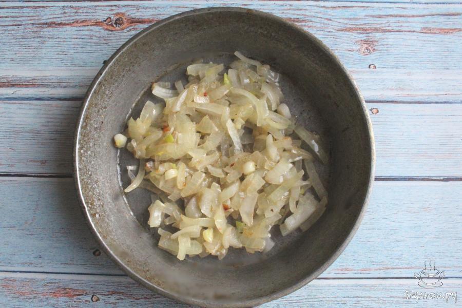 4. Лук почистим, промоем, нарежем небольшими кусочками. Обжарим лук до мягкости на небольшом количестве масла.