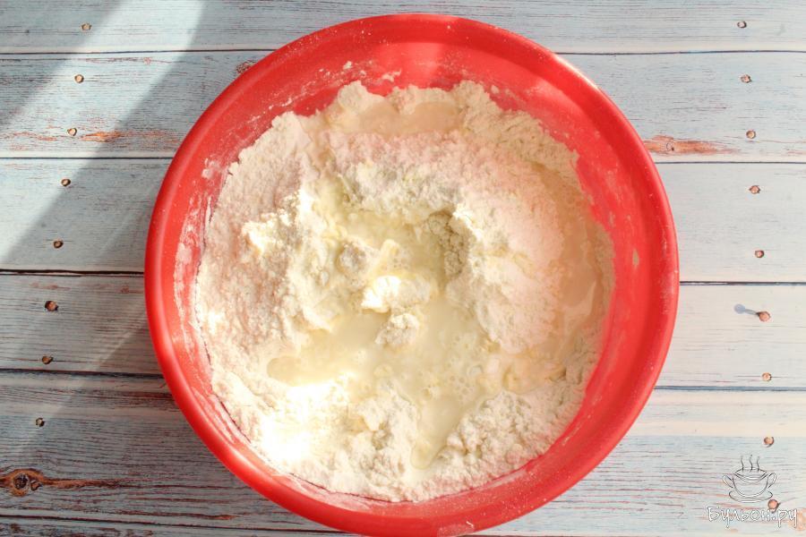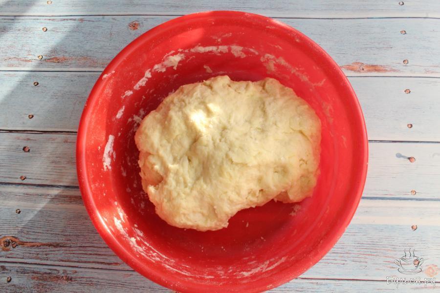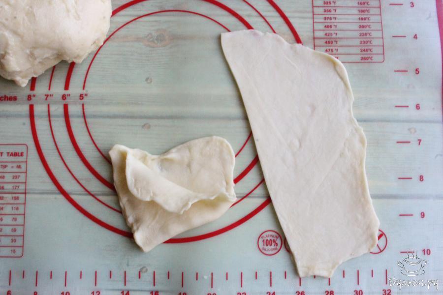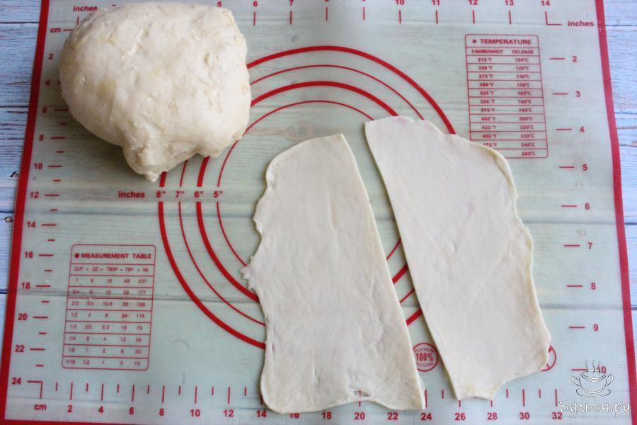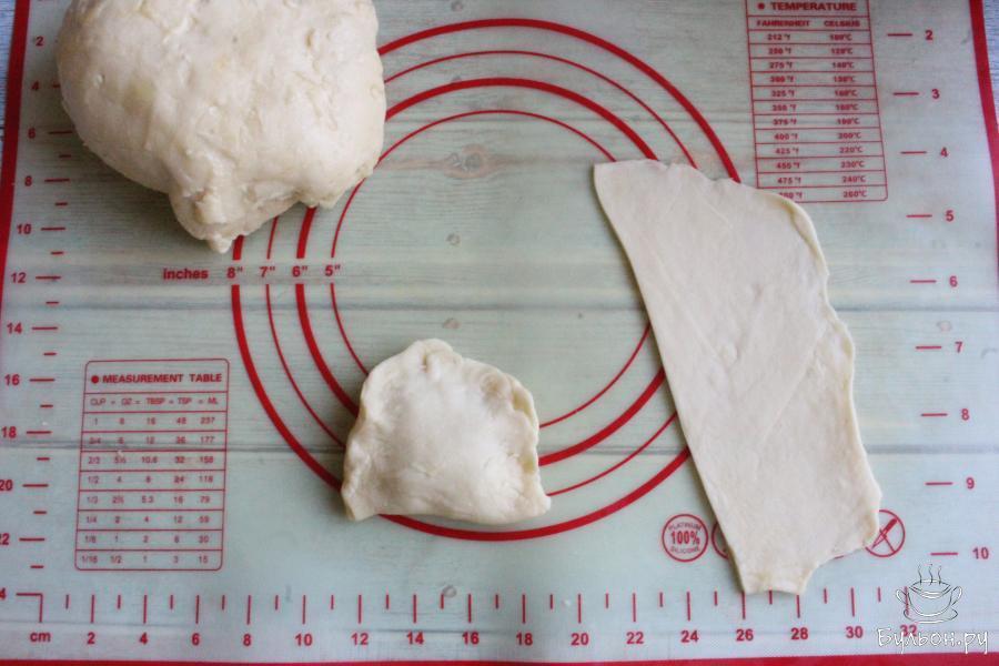 10. Отщипываем от теста кусочки размером с куриное яйцо. Раскатываем кусочки теста в круг и разрежем круг на две части.