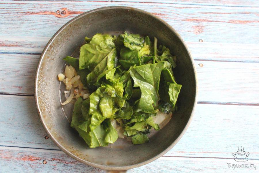 6. Выкладываем шпинат с луком в чашку. Яйца отварим вкрутую 10 минут после закипания воды, остудим и почистим. Нарежем яйца мелкими кусочками и добавляем к шпинату.