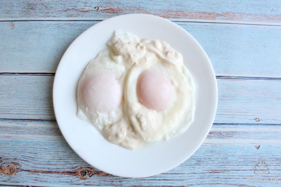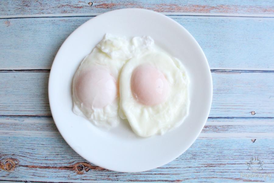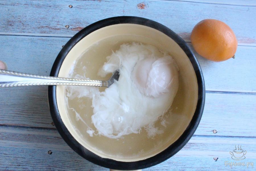 4. Яйца варим так: в кипящую воду, осторожно, вбиваем по одному яйцу и варим их 2-5 минут. Время зависит от того, какой консистенции вам нужен желток. Если варить яйцо пару минут, то желток будет жидкий.