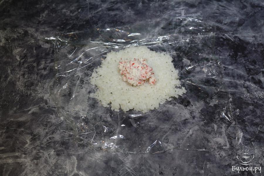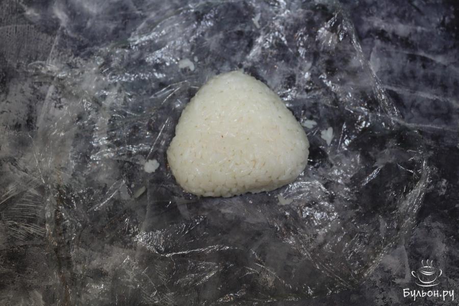 7. Сформируем рисовый шар, где внутри будет начинка. Далее, работая руками, превращаем шар в треугольник. Убираем пленку. Формируем следующий. И так до конца.