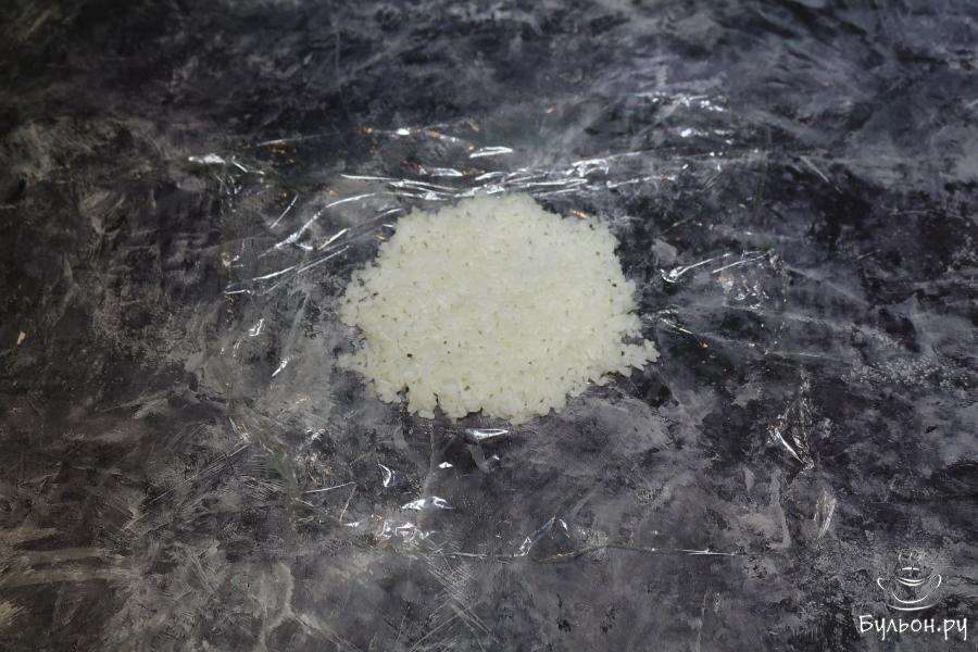 1. Круглозерный рис промоем несколько раз, зальем водой и поставим его вариться. Варим с закрытой крышкой четверть часа. Потом снимаем с огня, оставляем под крышкой еще на 10 минут.