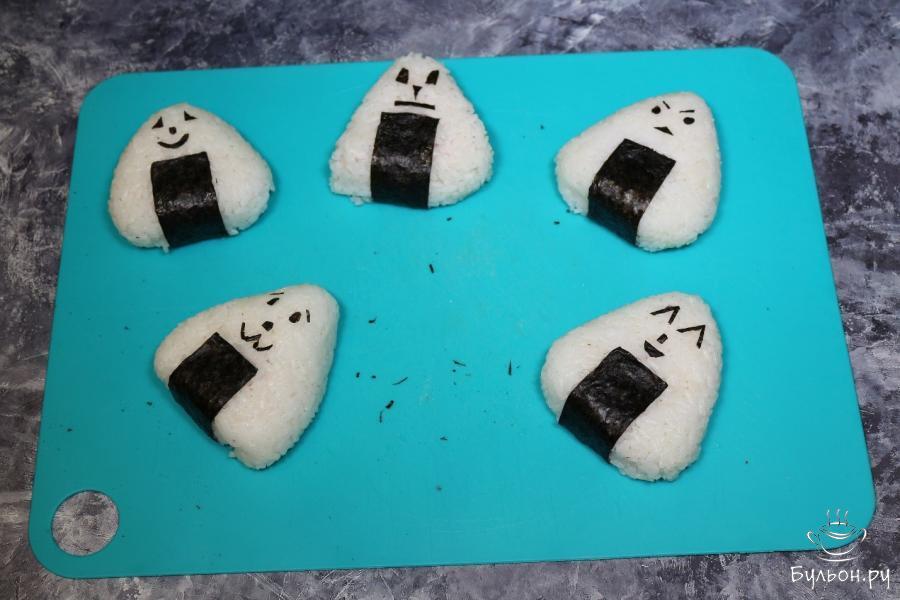8. Можно оставить рисовые треугольнички так, они уже полностью готовы к употреблению. А можно украсить. Делаем из нори с помощью ножниц веселые мордочки. Подаем с острым красным соусом, перцовой пастой, кетчупом или соевым соусом.