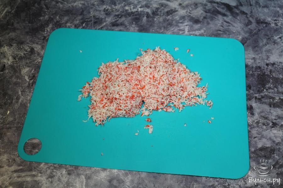 3. В миске смешиваем сливочный сыр с тертыми палочками, чтобы начинка стала единой. Чтобы начинку было легче вымешивать, лучше сыр достать до начала приготовления рецепта.