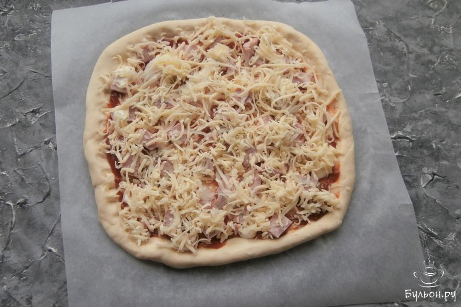 6. Пиццу готовить в разогретой, с температурой 220 град. духовке около 15 минут, она красиво запечется.