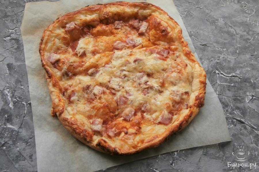 Предлагаю приготовить очень быструю домашнюю пиццу из готового слоеного теста. Тесто можно взять и бездрожжевое и дрожжевое, у меня - второй вариант. Для начинки я взяла обычную вареную колбасу "Столичную", можете использовать и копченую колбасу. Также можете добавить грибы, свежие помидоры или все то, что любите. Пицца получается очень вкусной, с тонкой, хрустящей слоеной основой и сочной начинкой. Готовится пицца не более 15 минут, рекомендую.