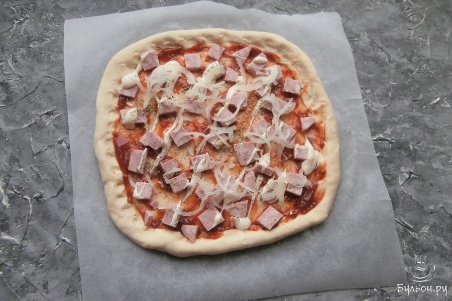 4. Далее, выложить порезанную кубиками вареную колбасу. Если будете использовать копченую - режьте ее тонкими кружочками. Сверху выложить порезанный очень тонкими четвертинами репчатый лук. Смазать все в виде полосочек майонезом, посыпать сушеным орегано и черным перцем.