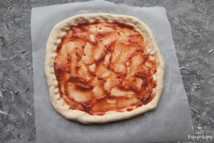 3. Края завернуть вовнутрь (в готовой пицце они не будут сухими). Смазать тесто любимым кетчупом или томатным соусом.