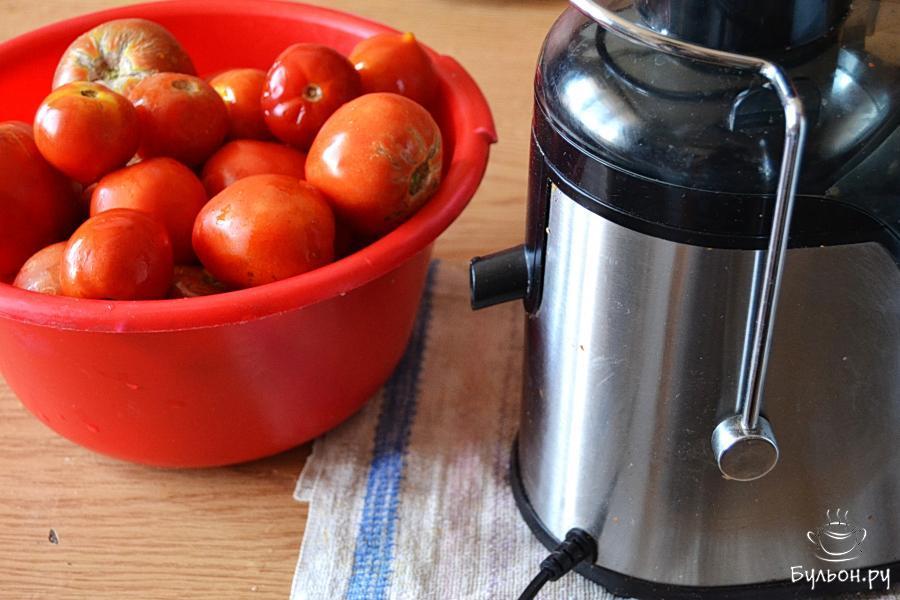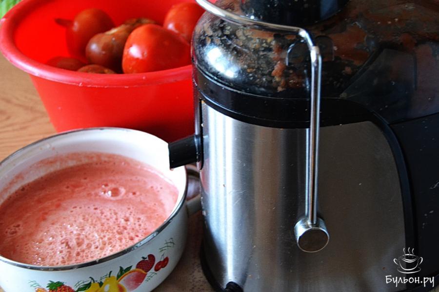 2. При помощи соковыжимаки выдавить из томатов сок. Мезгу, которая остается после выжимки, пропустить еще 2-3 раза (в зависимости от соковыжималки). Эту массу можно снова добавить к соку или же использовать для приготовления томатной пасты.