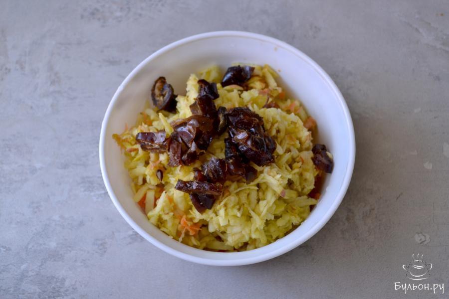 3. Перемешайте яблоки с морковью и добавьте финики. Финики предварительно вымойте, удалите косточки и нарежьте не крупными кусочками.