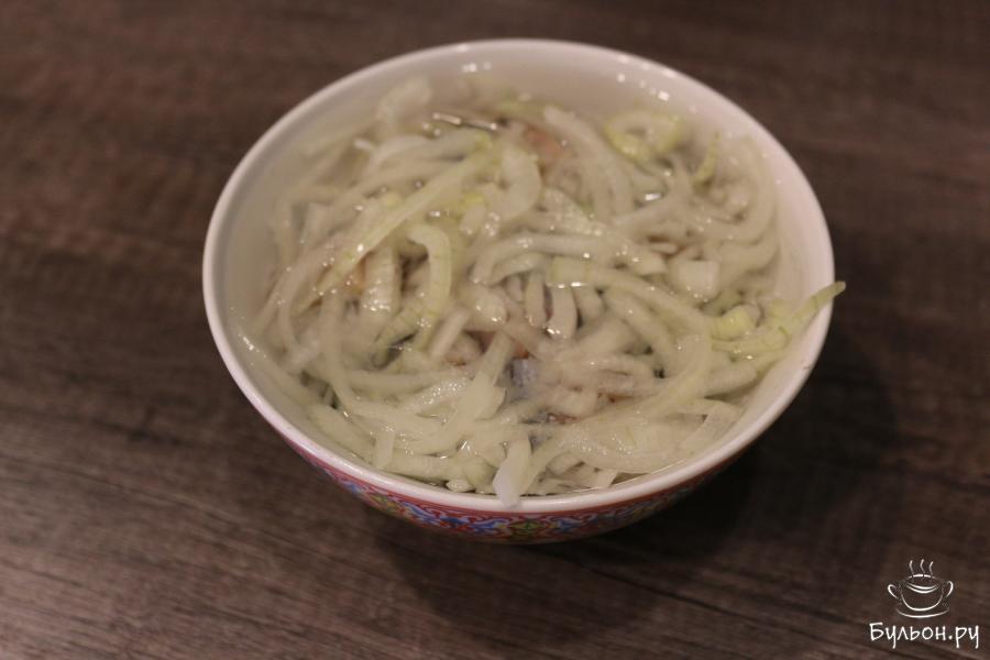 6. В одну миску кладем куски селедки, маринад и лук, перемешиваем и маринуем в холодильнике в течение 5-6 часов.