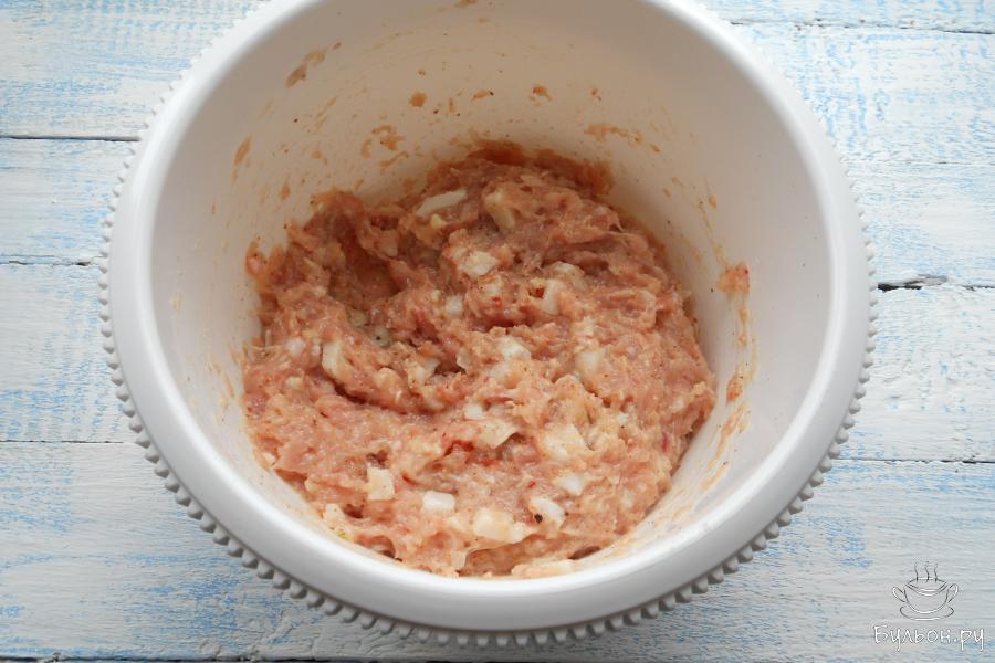 4. Сюда же добавить соль, перец, кориандр, паприку и пропущенный через пресс чеснок. Перец можно использовать как черный, так и белый.
