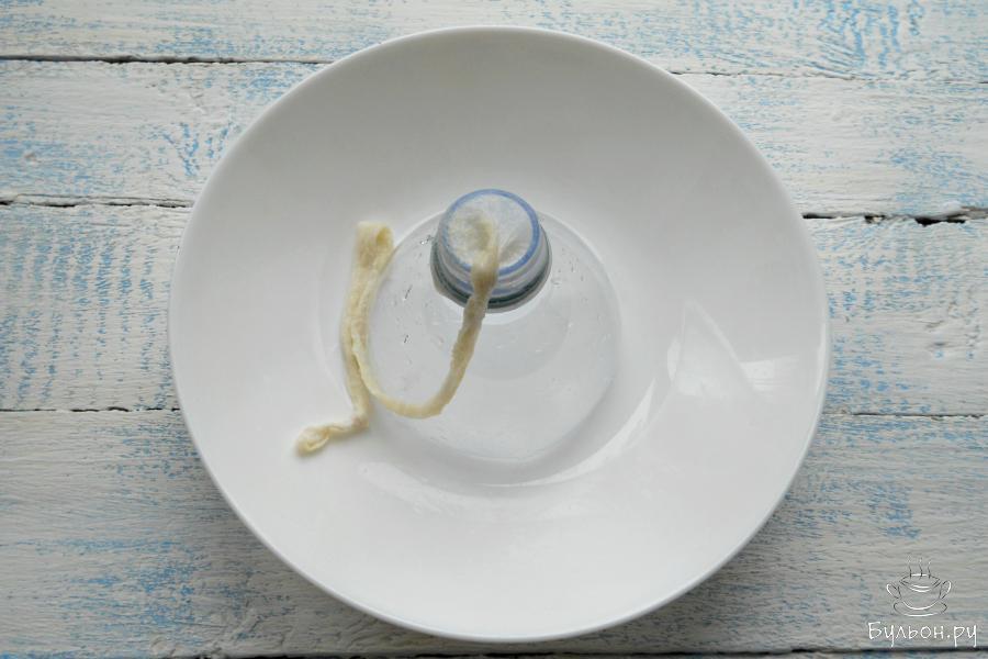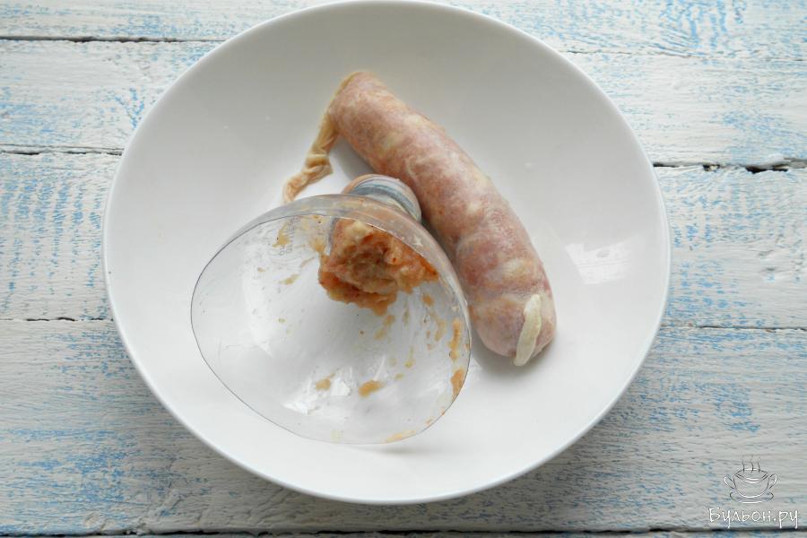 7. Далее, если у вас есть специальная насадка для мясорубки, наполняйте кишки фаршем с ее помощью. Если нет - обрежьте 1,5 л пластиковую бутылку, оставив часть с горлышком. На горлышко натянуть одну сторону кишки, другую - крепко перевязать.