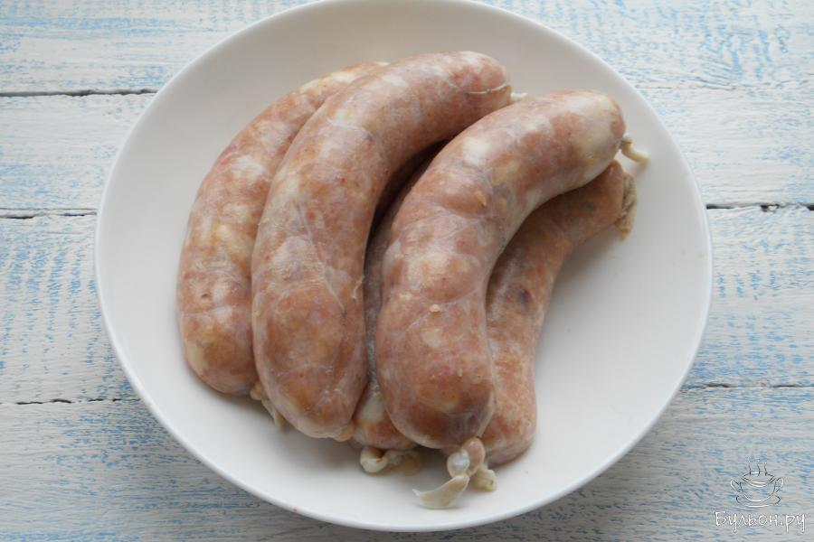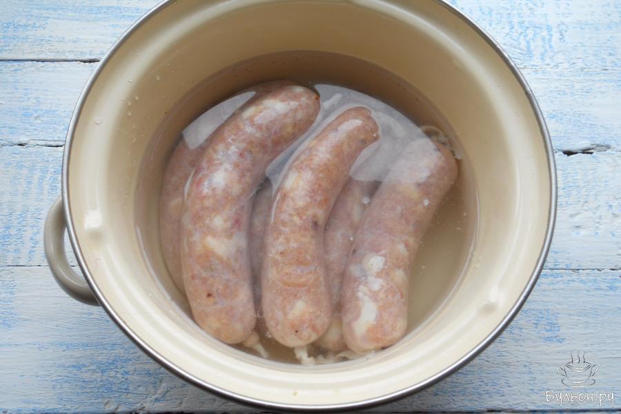 10. Колбаски поместить в кастрюлю, залить холодной водой. Довести воду до кипения, варить колбаски, не давая кипеть воде около 1 часа 30 минут. Очень удобно это делать в мультиварке на режиме "мультиповар" при температуре 90 градусов такое же время.