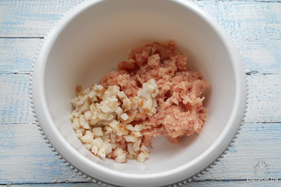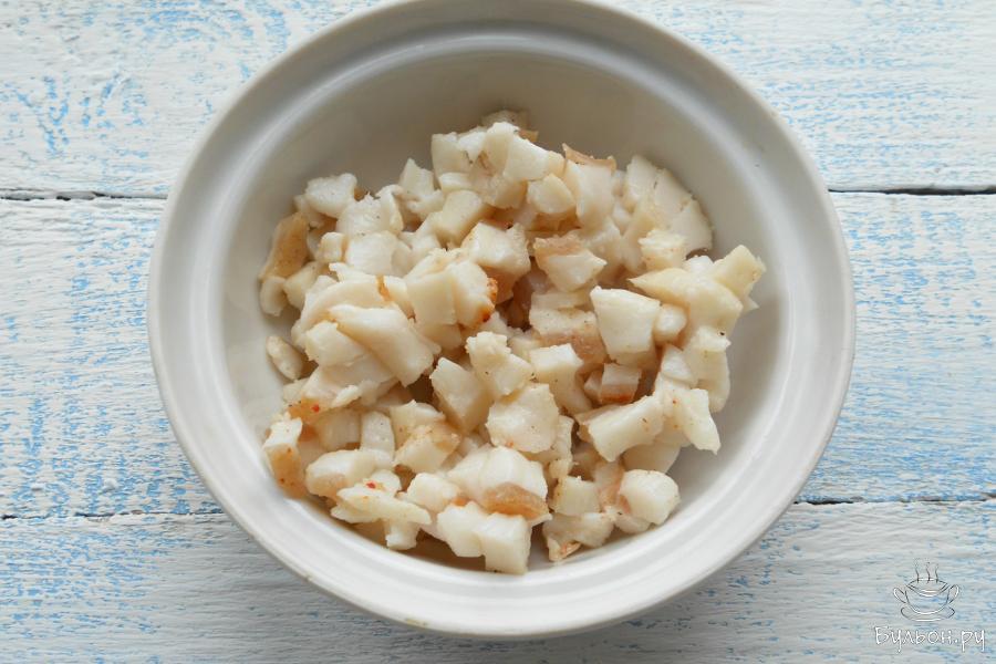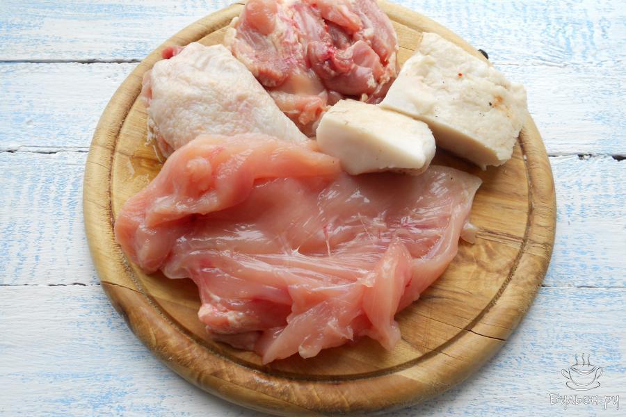 1. Подготовить куриное мясо и сало. Куриную грудку и бедра освободить от костей, сало - от шкуры, кожу на бедрах оставить. В данном рецепте я даю количество куриного мяса без костей.