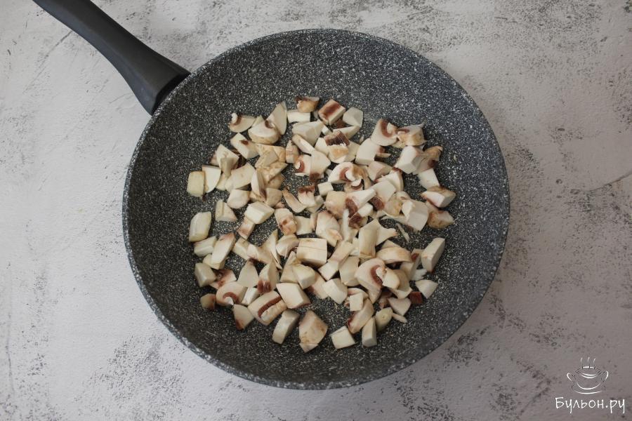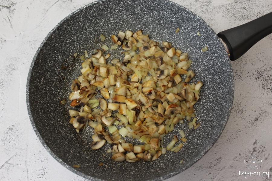 4. Затем, добавим к грибам оставшуюся половинку лука, нарезанную кубиками. Немного посолим и еще немного обжарим. Лук должен стать мягким.