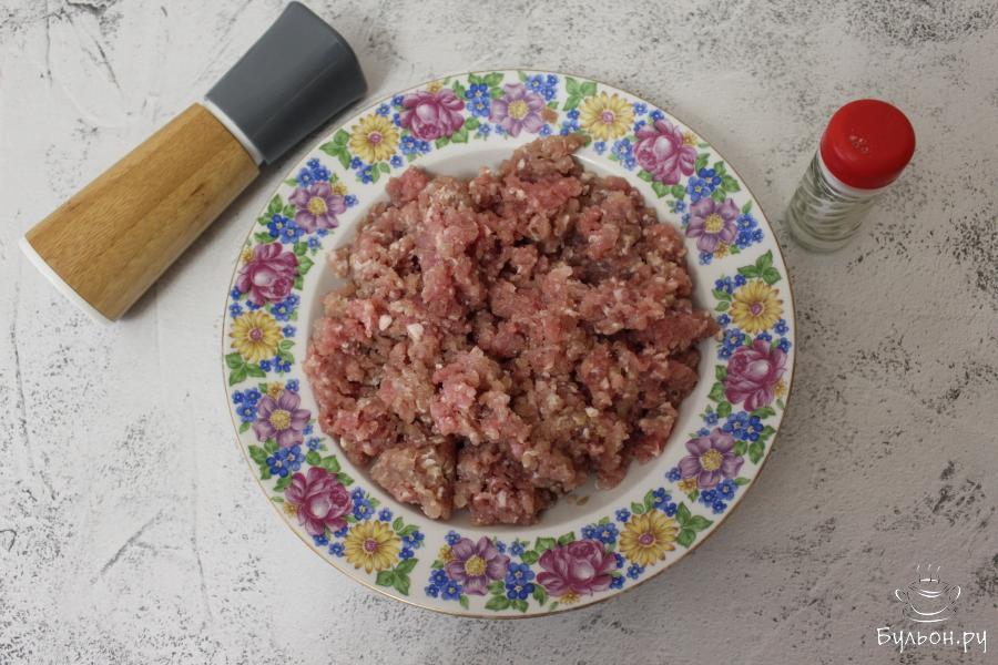 1. Первым делом пропустим через мясорубку свинину с половинкой крупной луковицы. Если лук у вас маленького размера, тогда для этого рецепта возьмите 2 луковицы. Получившийся фарш поперчим, посолим и перемешаем.