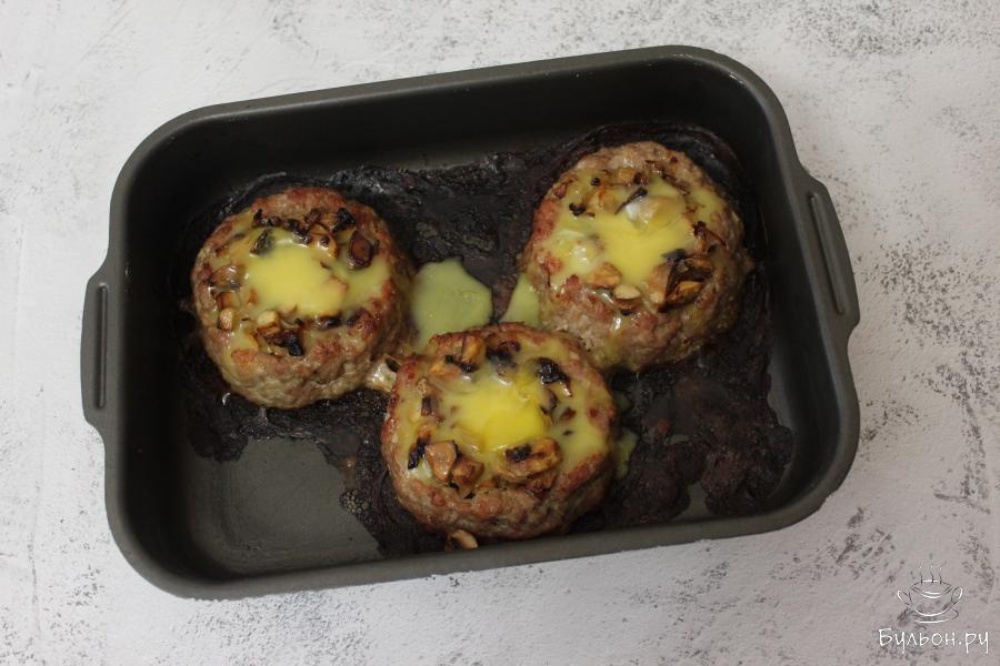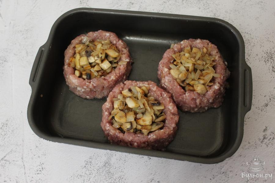 5. Готовую грибную начинку выложим в мясные гнезда и поставим форму в разогретую духовку на 35 минут. У меня была выставлена температура 180 градусов, но вы ориентируйтесь лучше на свою духовку.