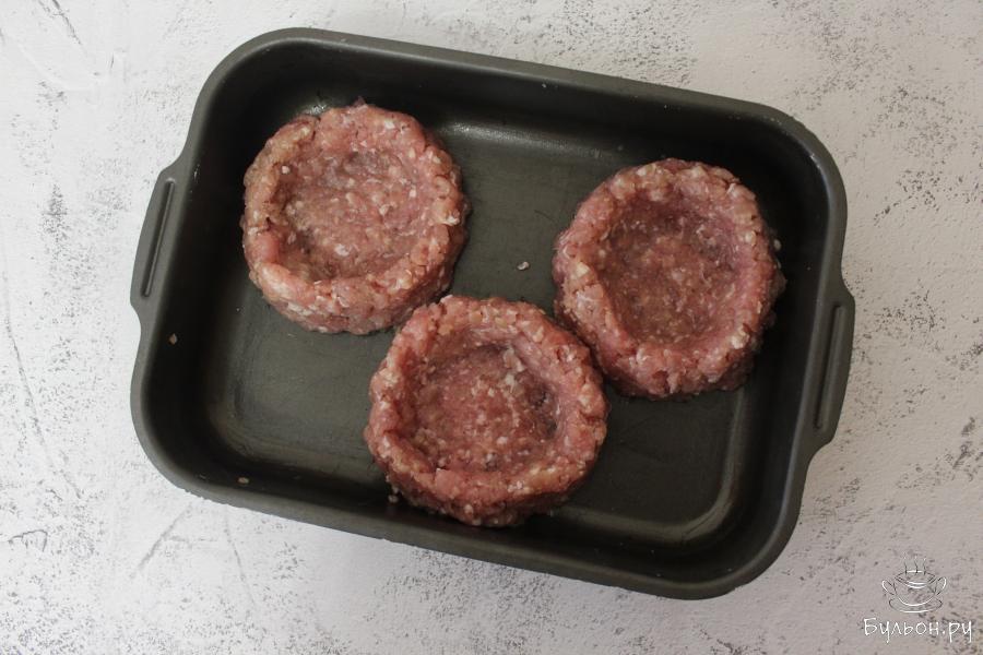 2. Форму, в которой будем выпекать, слегка смажем рафинированным маслом. Возьмем 1/3 фарша, скатаем в кружок, выложим в форму и слепим гнездо, делая углубление в центре. Из оставшегося фарша слепим еще 2 гнезда.