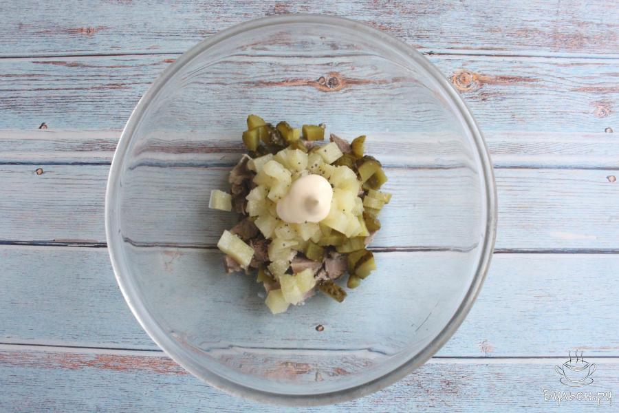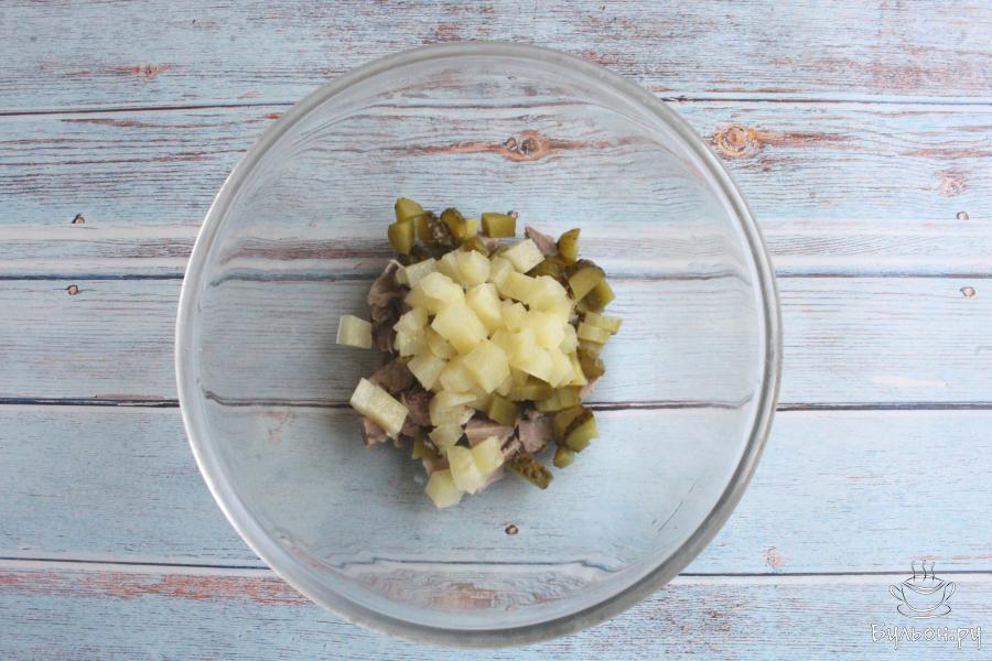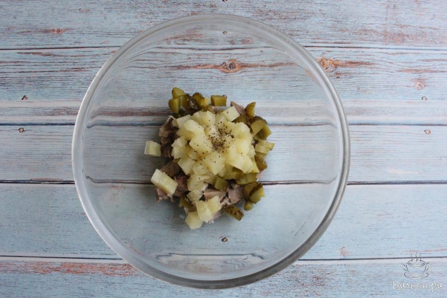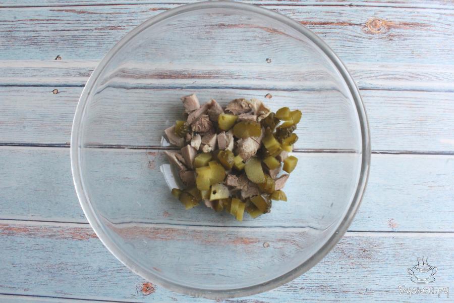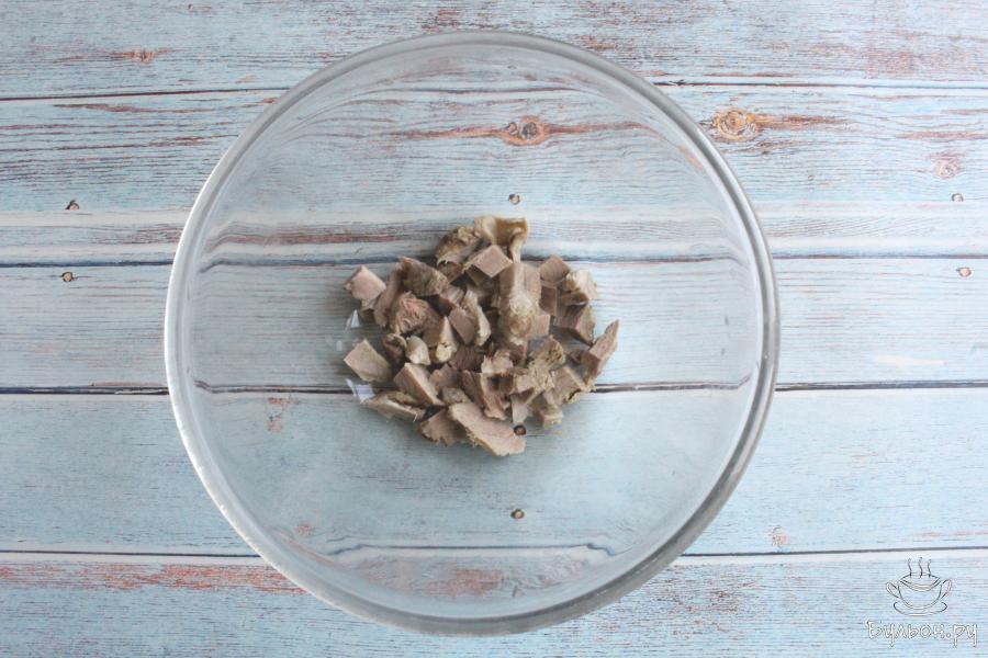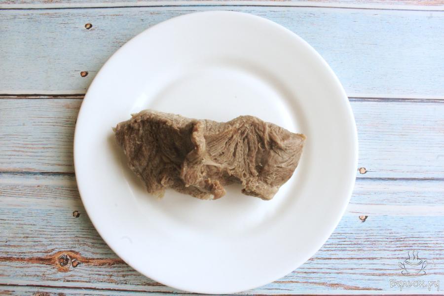 1. Свинину отварим до готовности. Если варить мясо одним кусочком, то уйдет около часа, небольшие кусочки будут готовы за полчаса. Мясо достаем из бульона и даем мясу остыть.