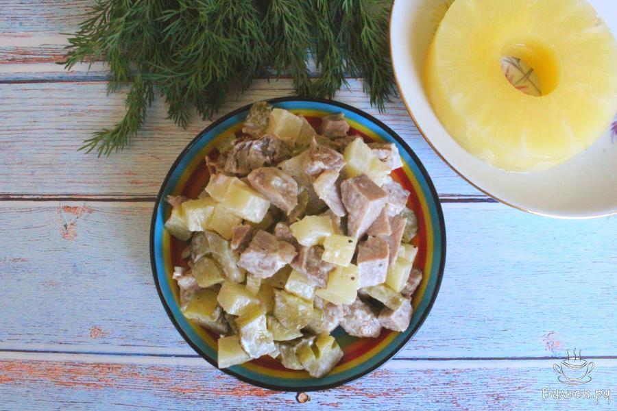 Мясной салат с ананасом понравится всем, кто любит необычные сочетания продуктов и салаты с небольшой сладостью. Такой салат можно готовить как с консервированным ананасом, так и со свежим. Салат получается очень сочный, пикантный, нежный, легкий, но одновременно и сытный. Для приготовления салата отлично подходит постная свинина. Этот салат можно предложить как к праздничному, так и к повседневному столу.