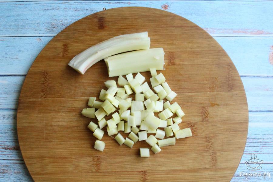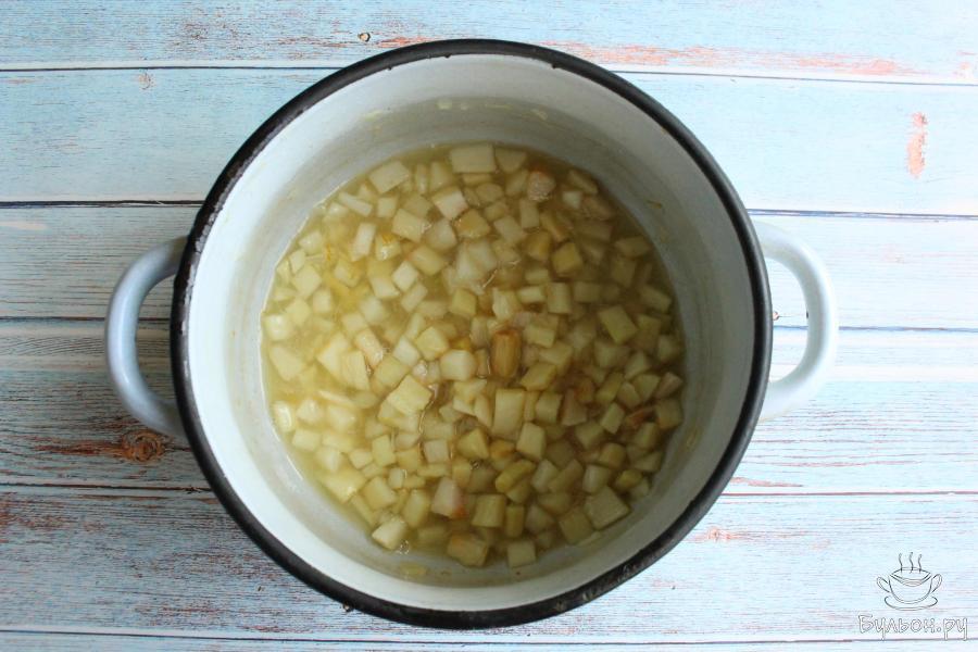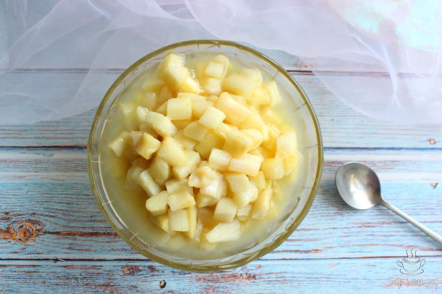 3. В кастрюлю выложим ревень, засыпем сахаром, накроем посуду крышкой. Оставим варенье на ночь, чтобы ревень пустил сок.
