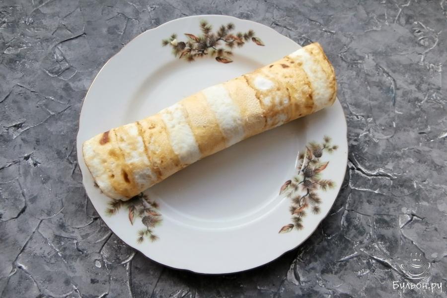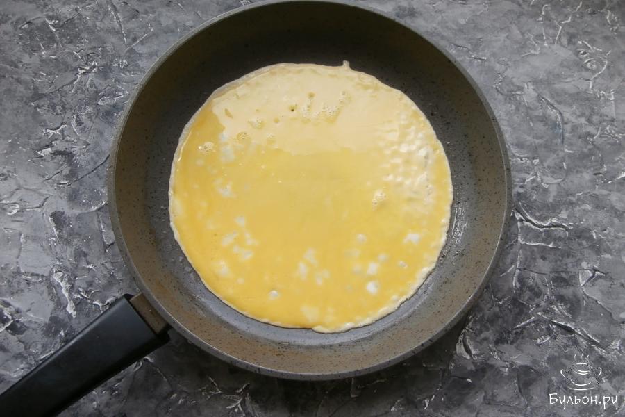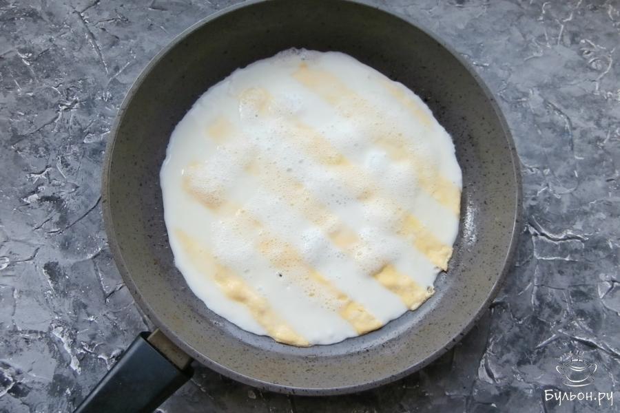 5. Сковороду разогреть, смазав растительным маслом, вылить в нее желтковую смесь, распределить по всей сковороде (сковорода, диаметр которой не менее 24-26 см).