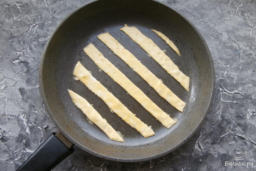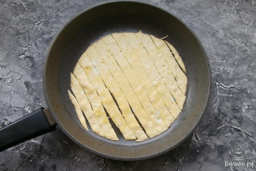 6. На небольшом огне жарить желтки до тех пор, пока их поверхность не станет сухой. Затем, лопаткой порезать желтковый блин на полоски шириной 1,5-2 см.