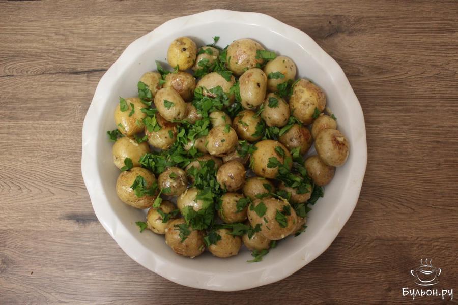 7. Готовый картофель выложим в блюдо, смажем сливочным маслом и посыпем зеленью. Вкусный ароматный бэби картофель готов!