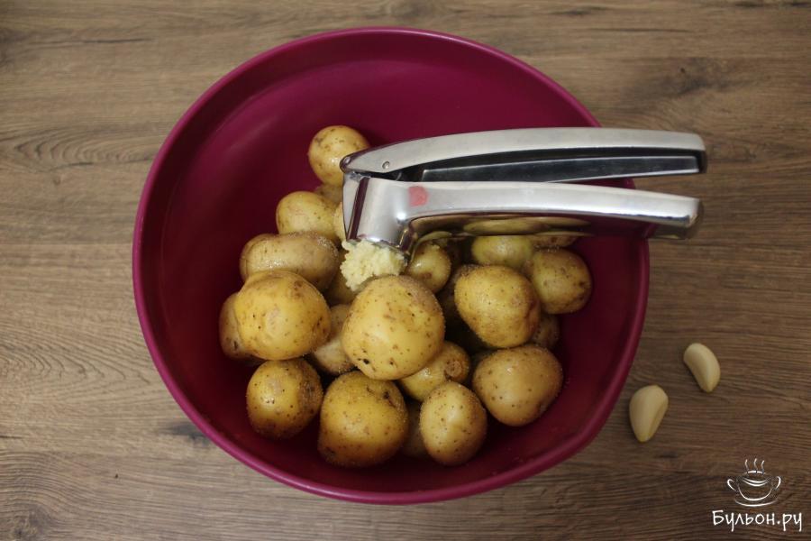 3. Теперь добавляем чеснок, пропущенный через пресс, и руками перемешиваем картофель, чтобы все маленькие картофеленки покрылись маслом, солью и чесноком.