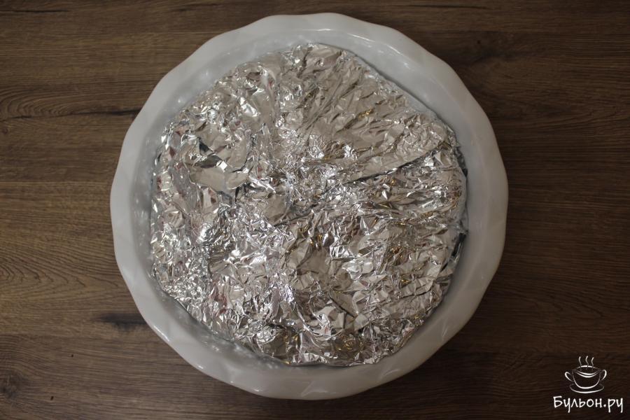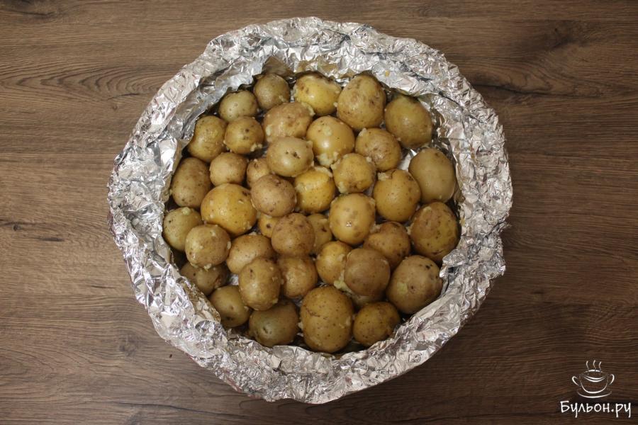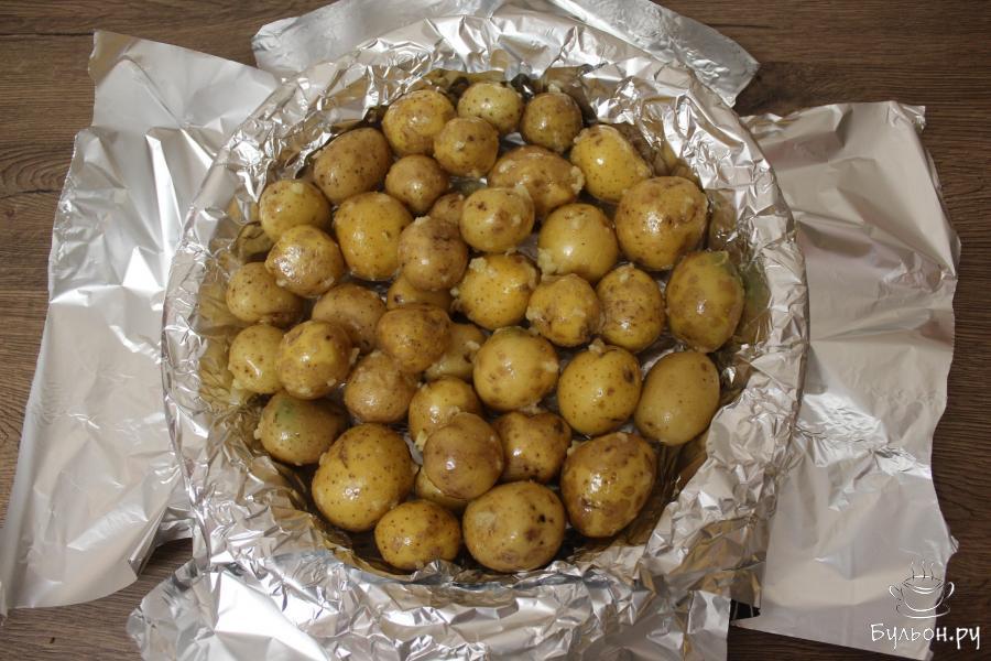5. Со всех сторон закроем картофель фольгой и поставим форму в духовку на 35 минут, предварительно разогрев духовку до 180 градусов.