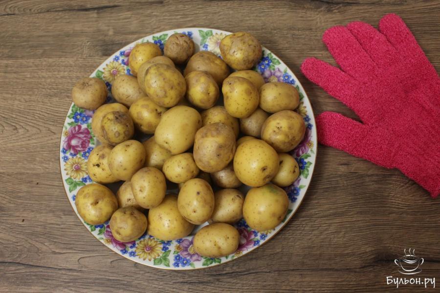 1. Первым делом картофель надо очень хорошо помыть, так как запекать его будем вместе с кожурой. Для мытья используем перчатку для душа, с ее помощью кожура чистится очень хорошо. Вымытый картофель выкладываем на полотенце, чтобы ушла лишняя вода.