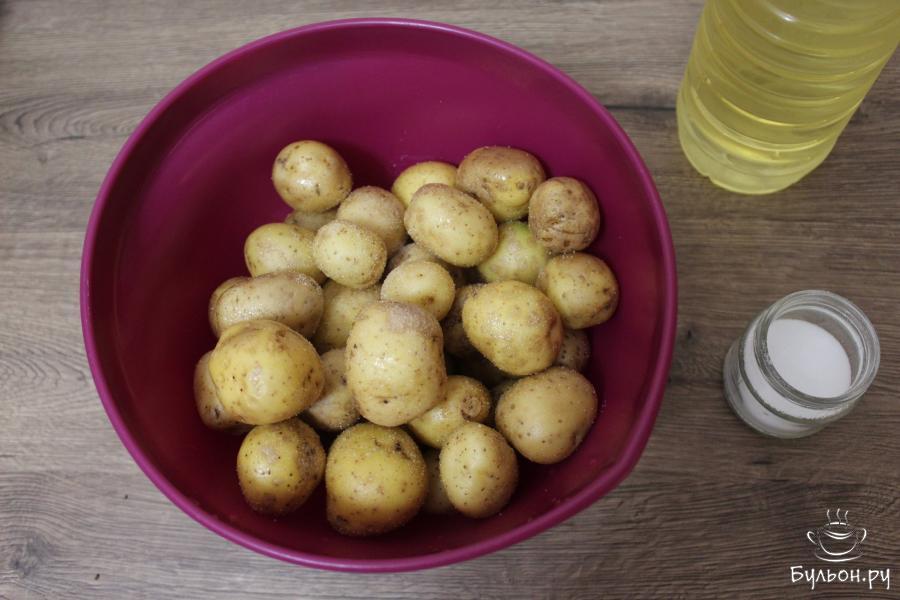 2. Обсушенный картофель выкладываем в глубокую миску и смешиваем с растительным маслом и солью. По желанию можно добавить и другие специи.