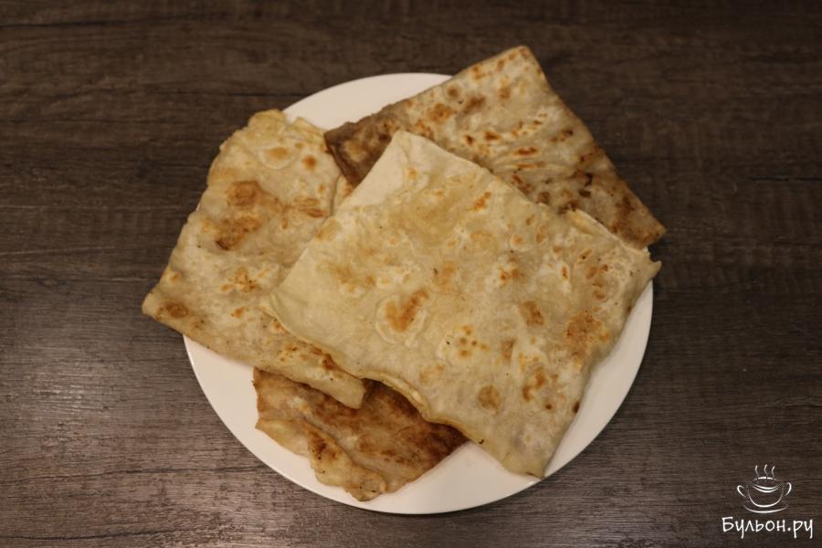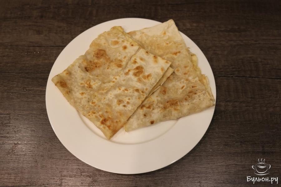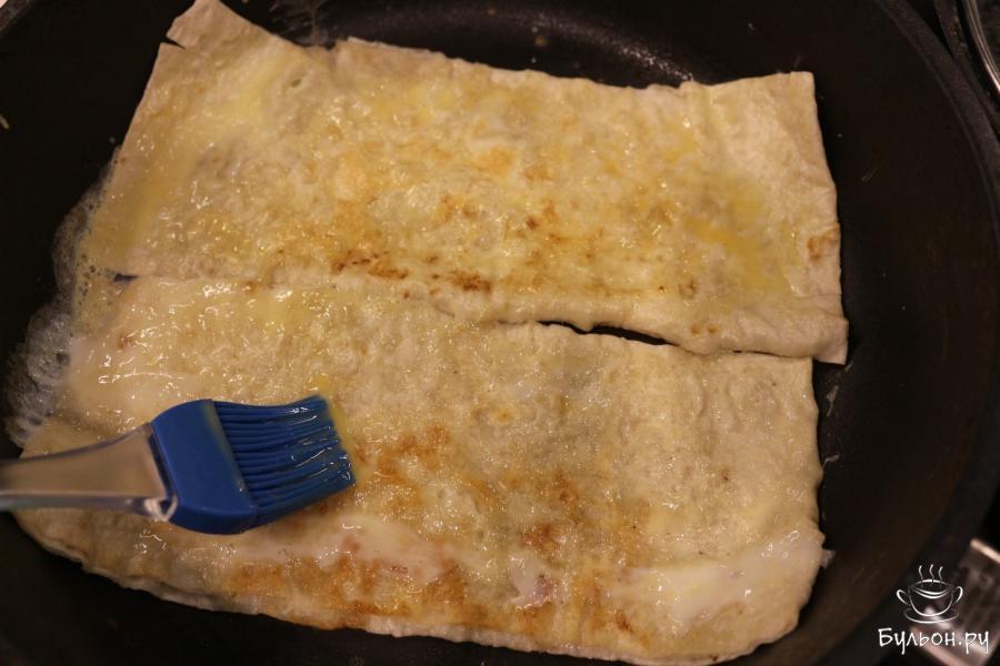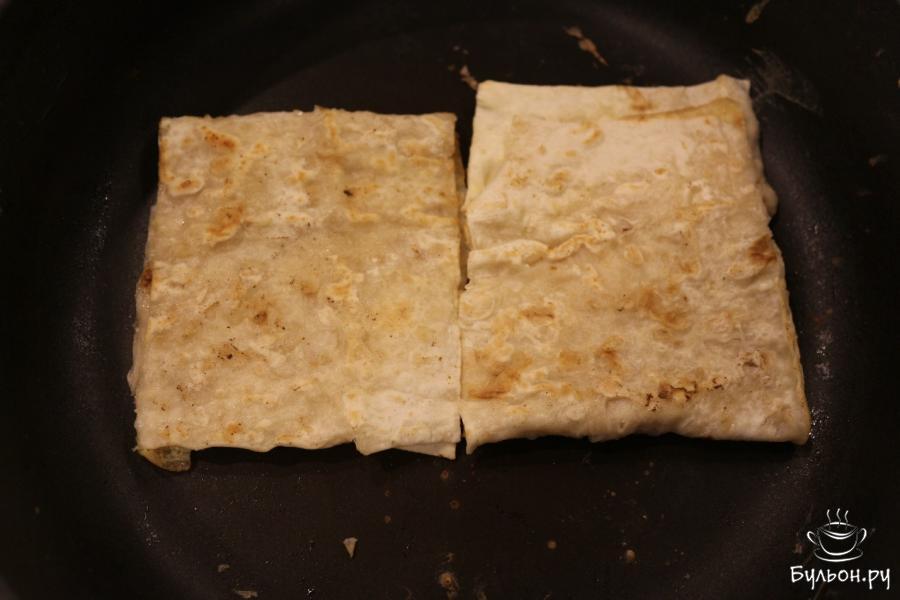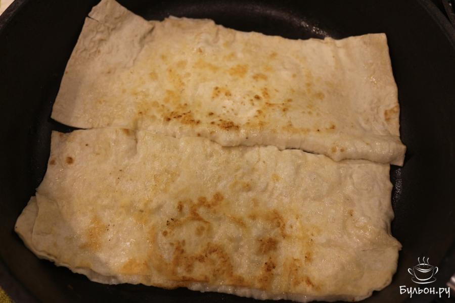 7. Лаваш кладем на разогретую сковороду. Со второй заготовкой делаем то же самое. Жарим на среднем огне 30-40 секунд.