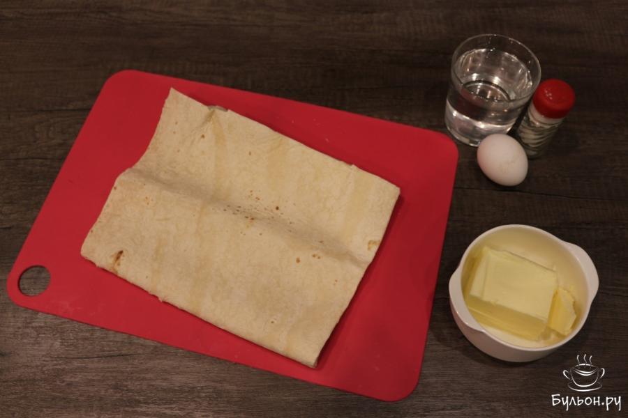 3. Теперь, из одного большого лаваша, делаем 4 небольшие заготовки. Лаваш сложим пополам и нарежем его на толстые, по ширине, длинные полоски (как на фото), таким образом, чтобы они были в размер диаметра сковороды, либо поменьше.