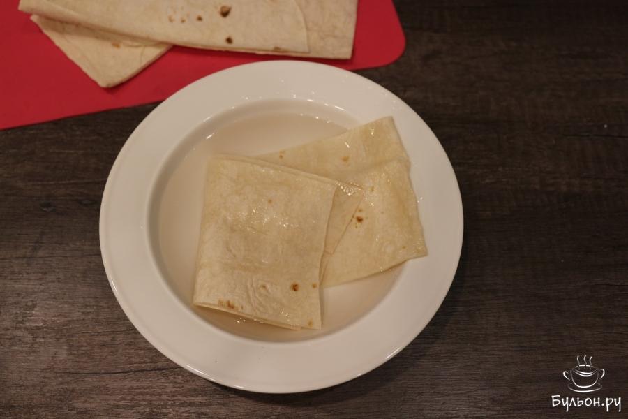 9. Снова переворачиваем лаваши так, чтобы яичная сторона оказалась внизу, на дне сковороды. Сверху на лаваши вливаем снова по 1,5 ложки подсоленной воды. Затем снова переворачиваем лаваши и складываем каждый из них пополам. Жарим еще буквально по 20 секунд с каждой стороны. Снимаем со сковороды.