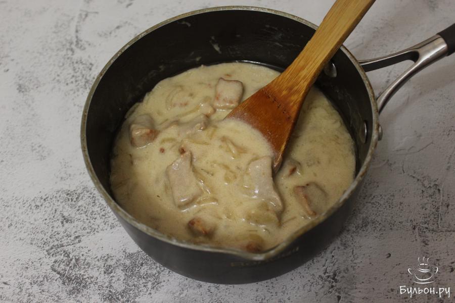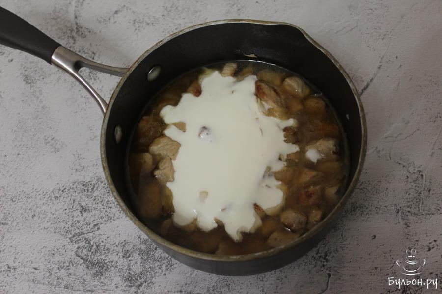 6. Через указанное время откроем крышку и еще раз перемешав сметанный соус, вольем его в ковшик с мясом. Также добавим соль и перец. Перемешаем, снова доведем до кипения, и будем тушить еще примерно 10-15 минут.