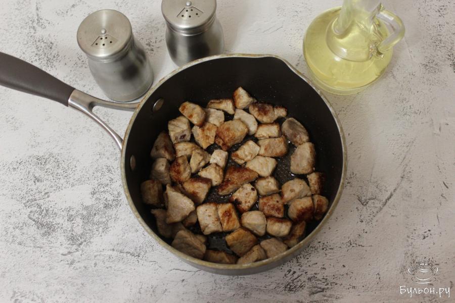 2. Нарезанную свинину перекладываем в ковшик и на очень сильном огне на рафинированном масле обжариваем кусочки мяса до золотистой корочки.