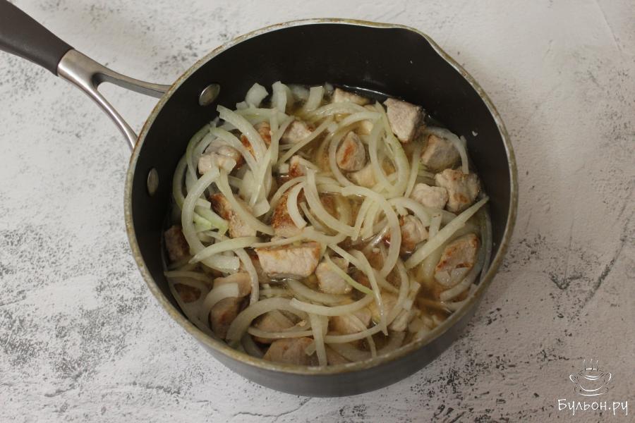 5. К обжаренному мясу добавим полукольца лука и зальем, заранее свареным, мясным бульоном. Помимо мясного бульона можно использовать овощной или просто воду. Закроем ковшик крышкой и будем тушить мясо с луком в течение 20-25 минут.