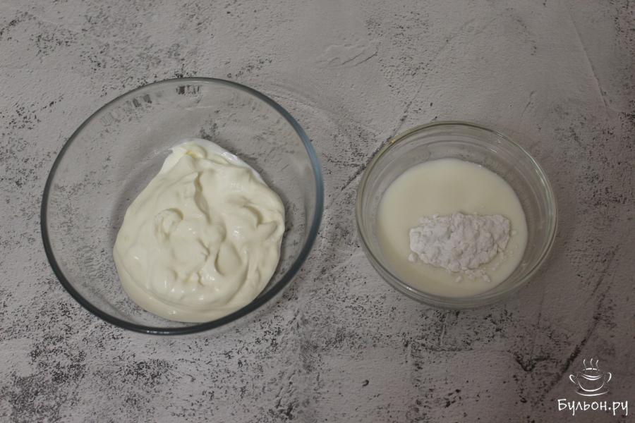 4. В глубокую емкость выложим сметану. Отдельно, в небольшую пиалу нальем молоко, всыпем картофельный крахмал и тщательно размешаем, чтобы не было комочков. Через сито перельем молоко с крахмалом в сметану и перемешаем.