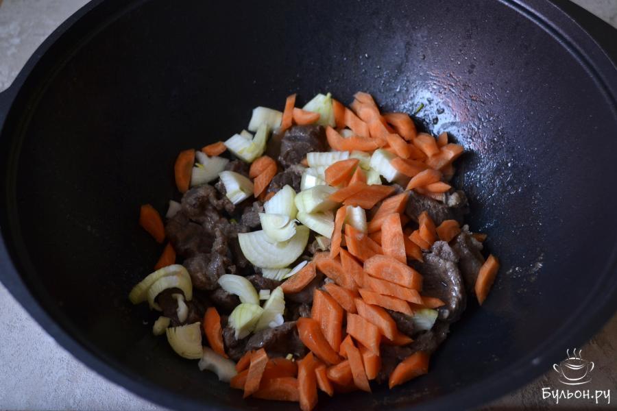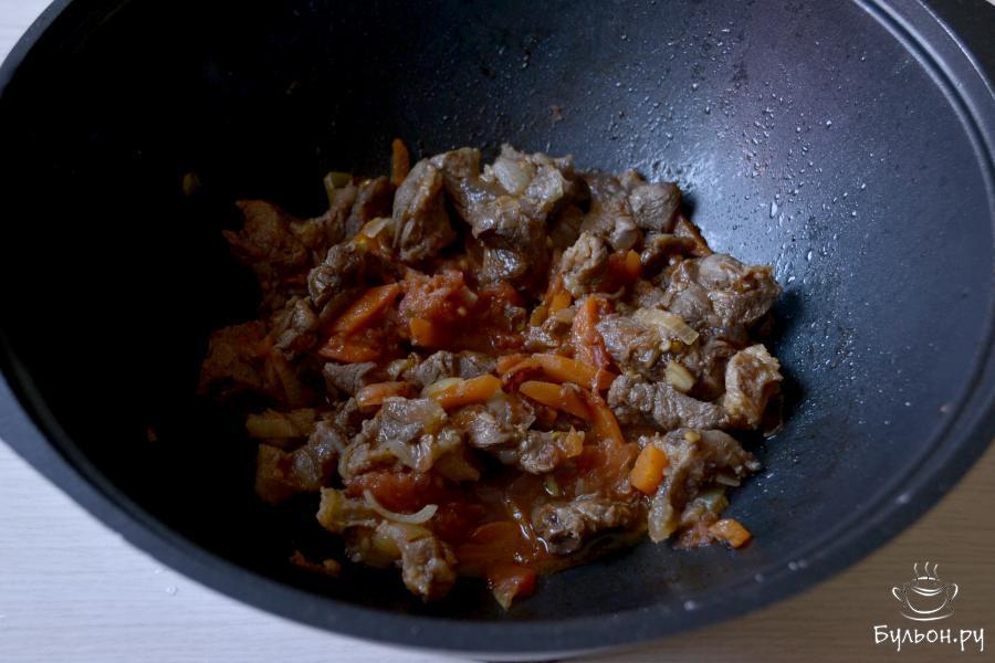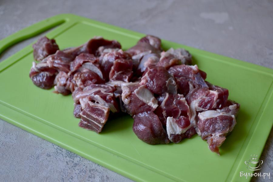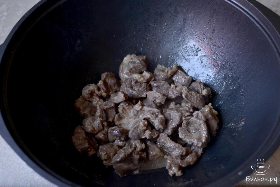 2. Разогрейте растительное масло в казане или кастрюле с толстым дном и отправьте нарезанное мясо. С момента закипания, сделайте огонь минимальным и тушите мясо под крышкой.