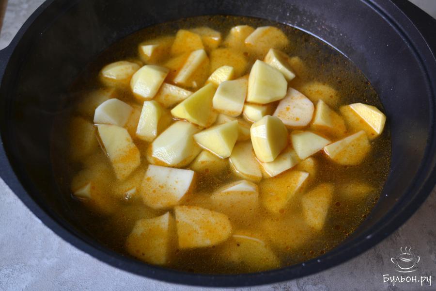 9. Добавьте картофель в казан и залейте горячей водой, чтобы немного его покрыла. Посолите. Варите до готовности картофеля.