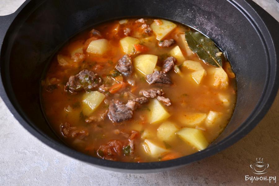 10. За 5 минут до отключения посыпьте жаркое сушеной петрушкой, добавьте лавровый лист и острый красный перец.