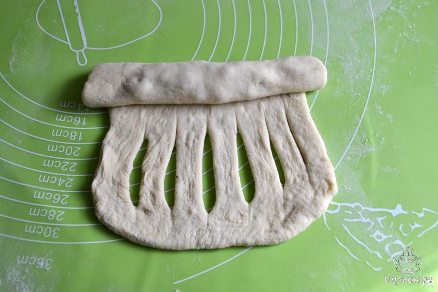1. Возьмите готовое дрожжевое тесто. Разделите на равные кусочки. Чтобы сделать рогалик, кусочек теста раскатайте в прямоугольный пласт, размером примерно 10х20 см. С меньшей стороны сделайте надрезы, отступая от края 1 см., до середины пласта. На противоположный край пласта положите густое варенье.