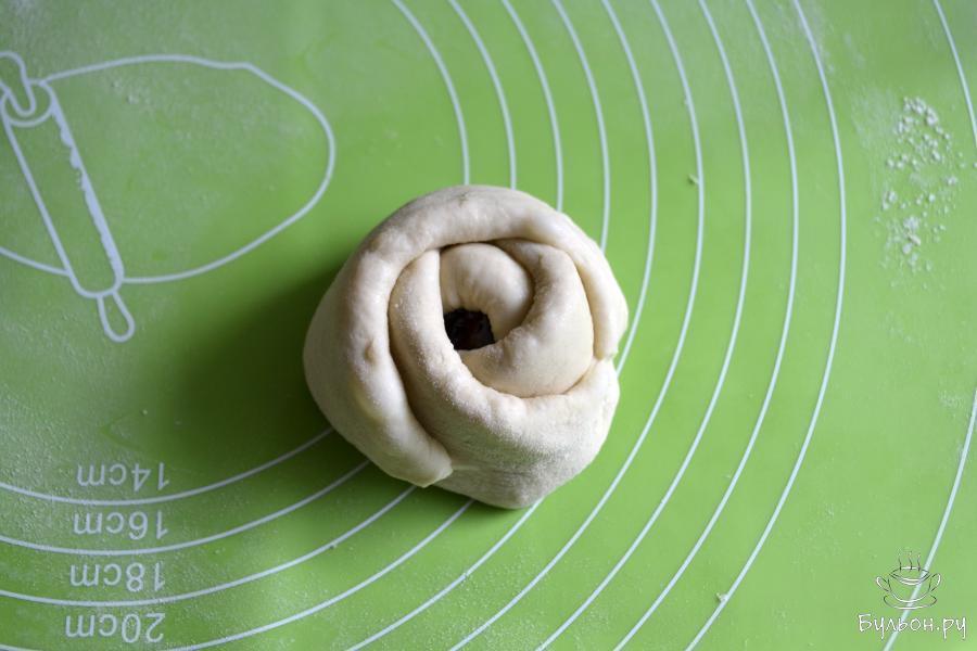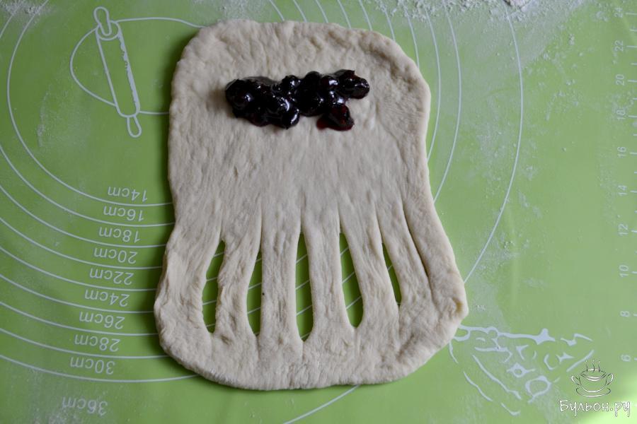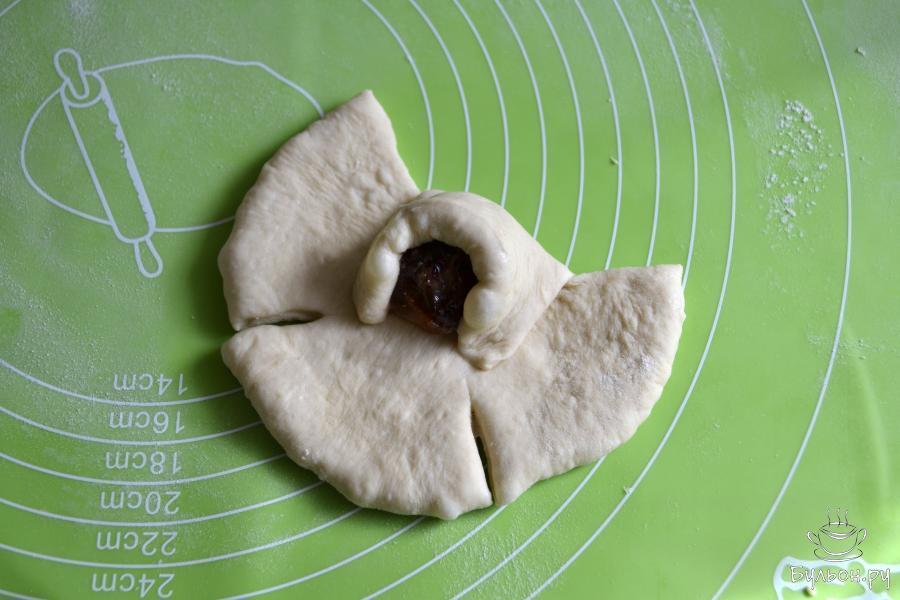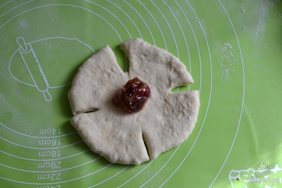 5. Чтобы сделать булочки-розочки, раскатайте тесто в тонкую круглую лепешку. В центр лепешки положите густую начинку, сделайте 4 надреза - лепестка, начиная от края и не доходя до центра, примерно по 1,5-2 см.