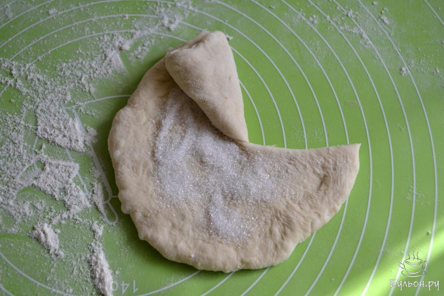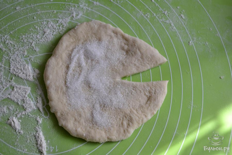 10. Для булочки-кометы, раскатайте тесто в тонкую, круглую, лепешку. Сделайте один надрез от центра лепешки до края. Посыпьте лепешку сахаром.